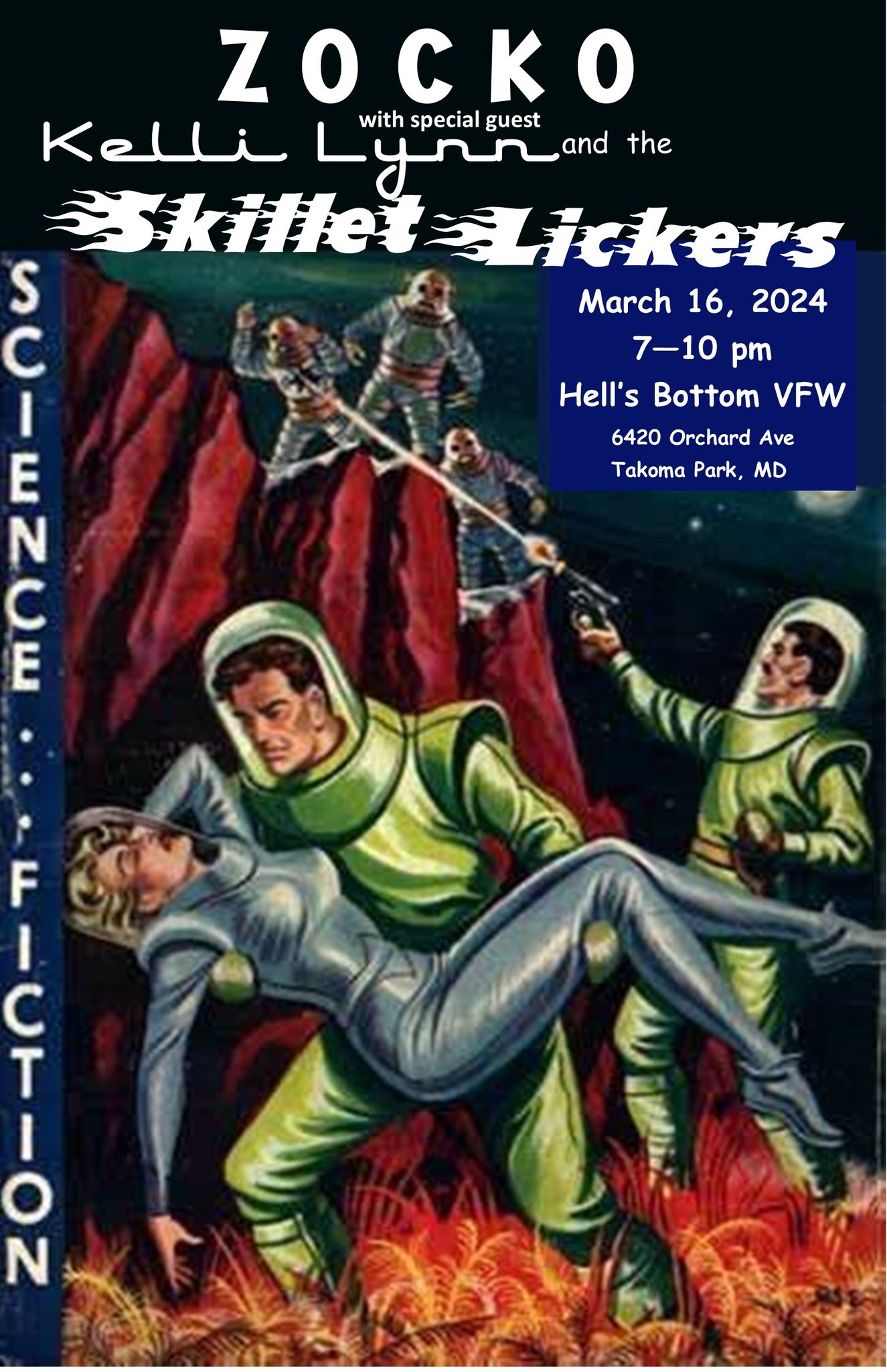 Sat March 16 - ZOCKO! with Kelli Lynn and the Skillet Lickers at VFW Post 350 "Hells Bottom" (Takoma Park, MD). (Facebook event page)