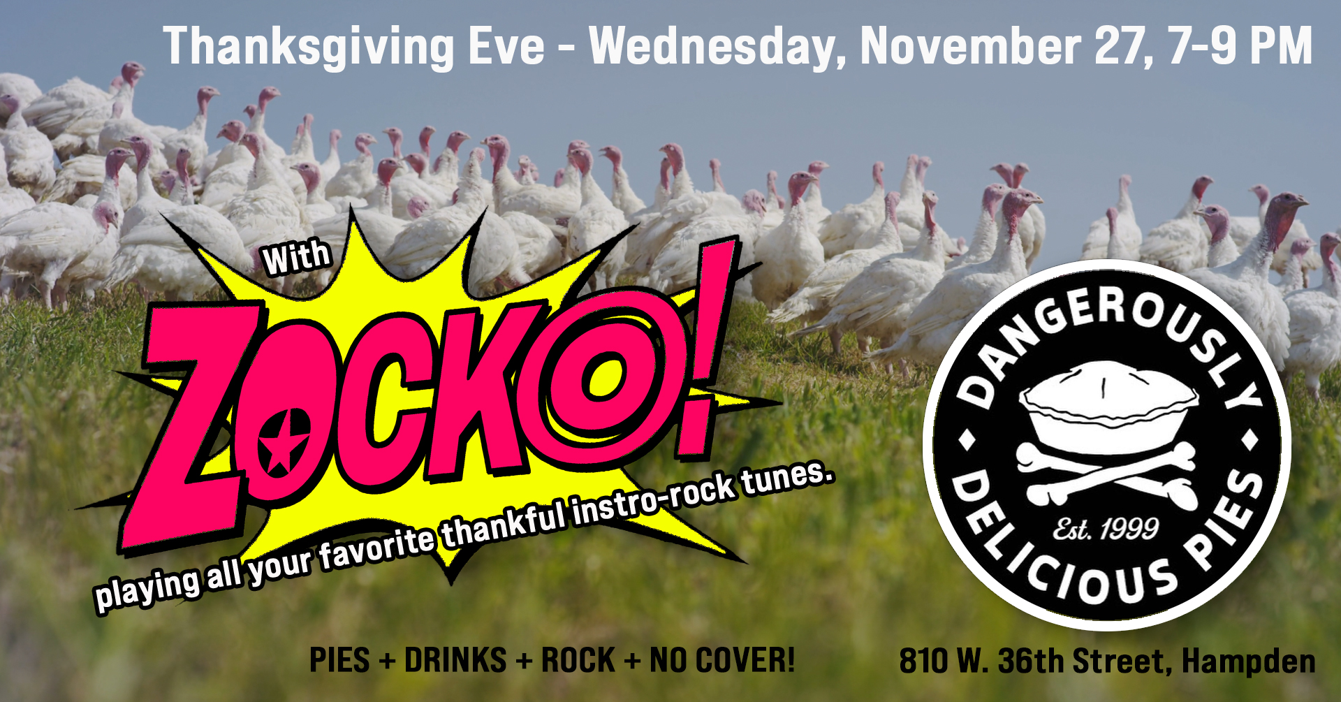 Wed Nov 27 - ZOCKO! kicks off Thanksgiving weekend at Dangerously Delicious Pies. (Facebook event page)