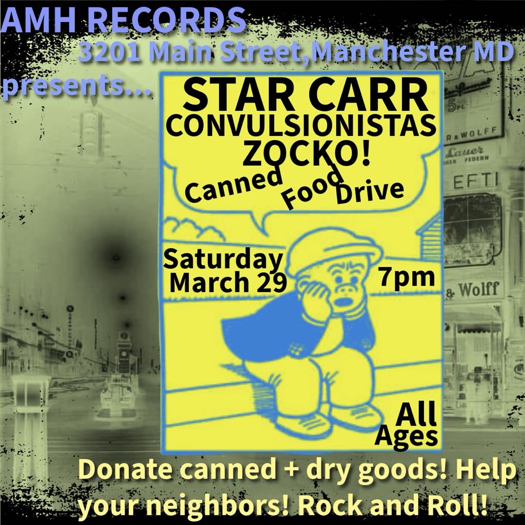 Sat March 29 - Food Drive benefit show featuring ZOCKO!, Star Carr, and Convulsionistas, at AMH Records. (Manchester, MD) (Facebook event page)