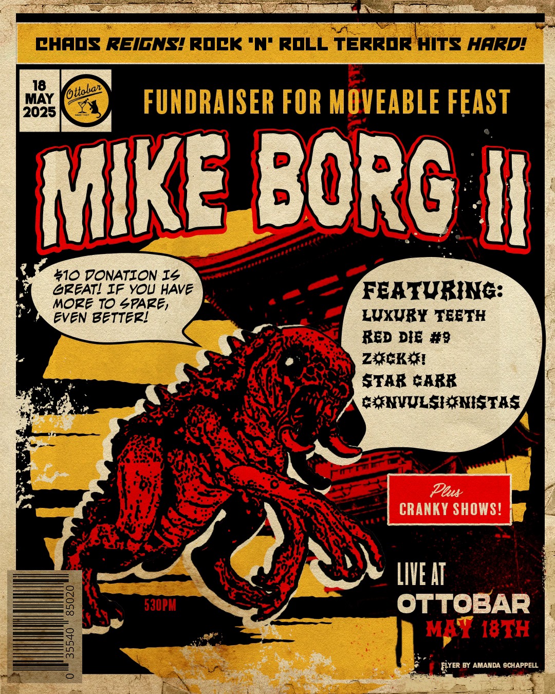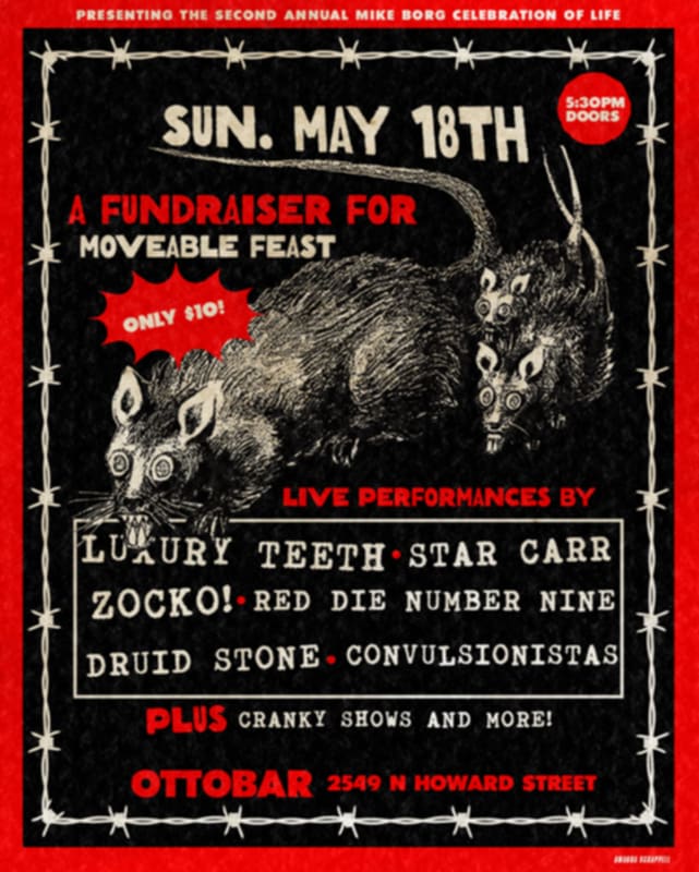 Sun May 18 - ZOCKO! with Luxury Teeth, Red Die #9, Star Carr, Druid Stone and Convulsionistas, as part of Mike Borg II fundraiser for Moveable Feast at Ottobar. 5:30pm doors. (Facebook event page)