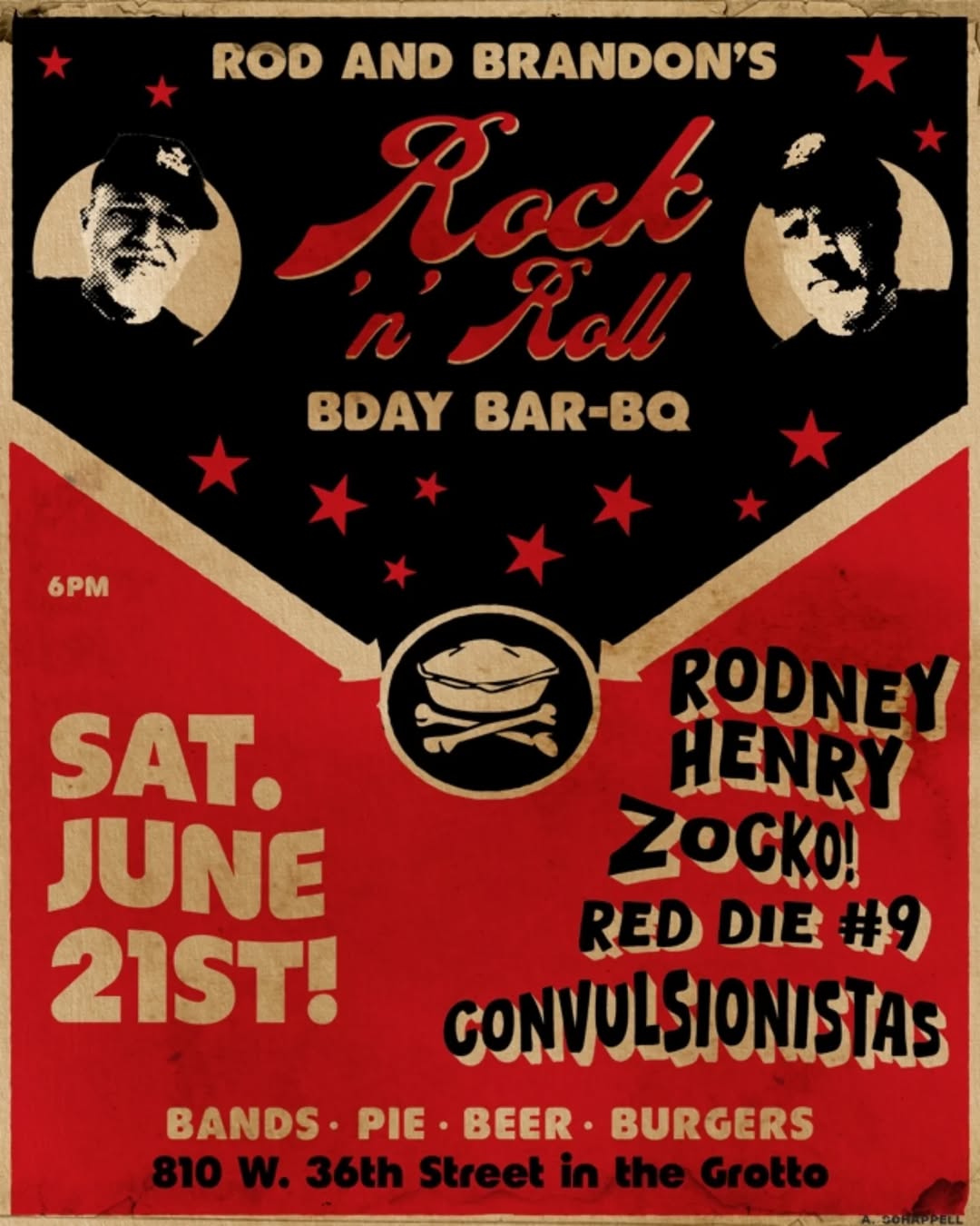 Sat June 21 - Rodney & Brandon's Rock 'n' Roll Birthday BBQ with ZOCKO!, Convulsionistas, Rodney Henry, and Red Die #9 at Dangerously Delicious Pies.