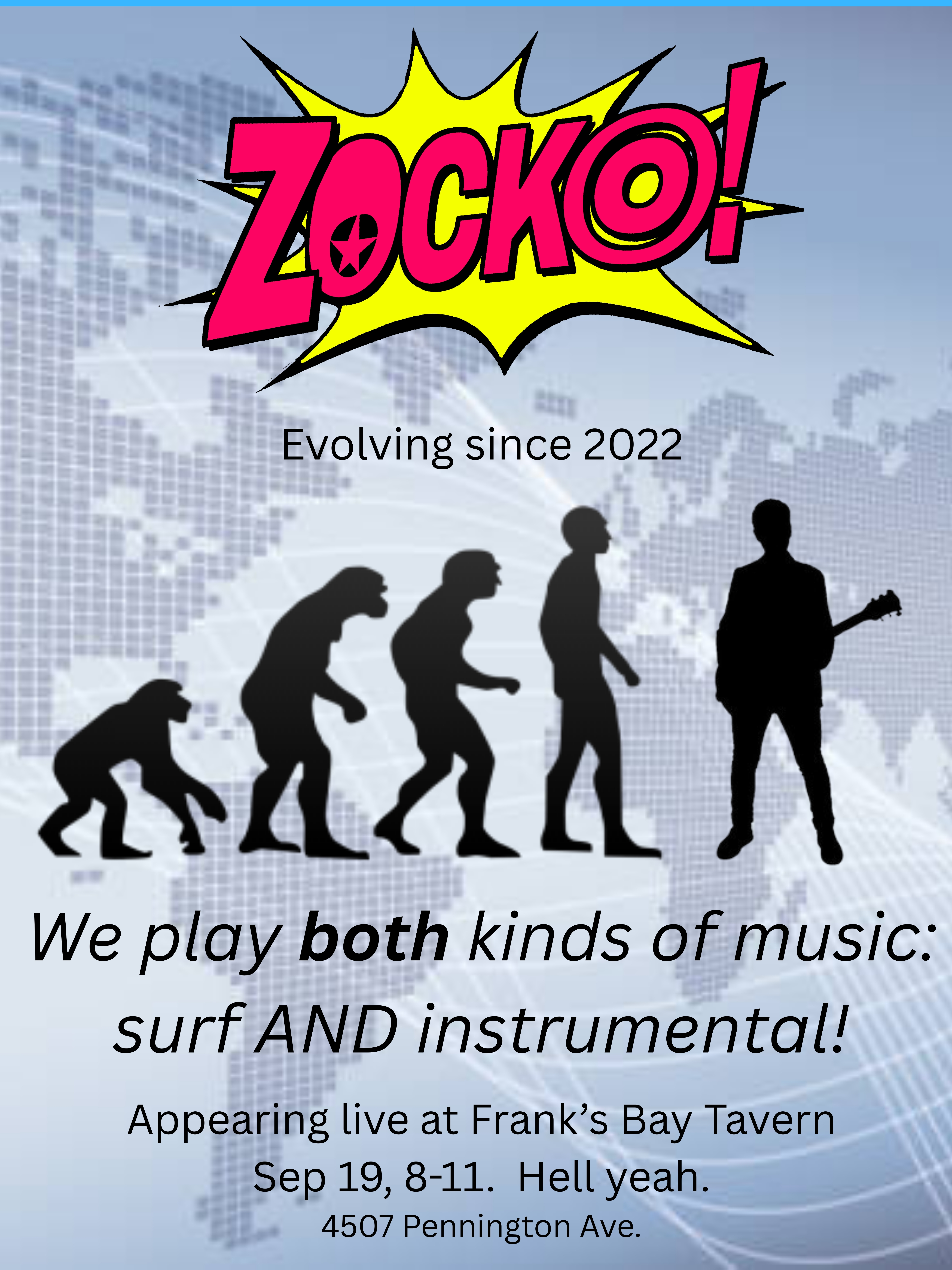 Fri Sept 19 - ZOCKO! at Frank's Bay Tavern. (Facebook event page)