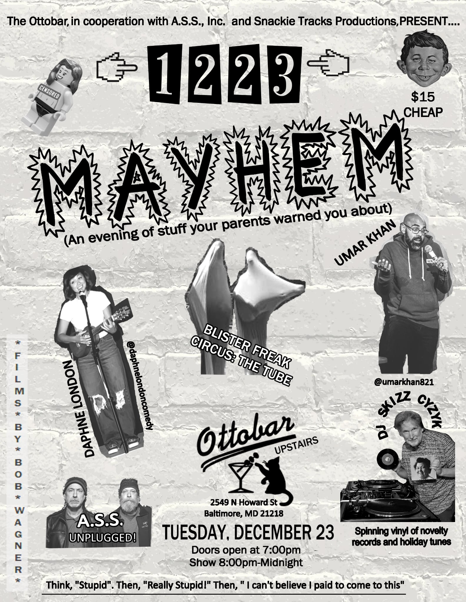 Tue Dec 23 - 1223 MAYHEM! featuring DJ Skizz Cyzyk spinning vinyl novelty and holiday records, Blister Freak Circus: The Tube, Augie Snackie Show UNPLUGGED, Daphne London, Umar Khan, 16mm Films compliments of Bob Wagner, and “Surprise” Guests! Ottobar. more info (Facebook event page)