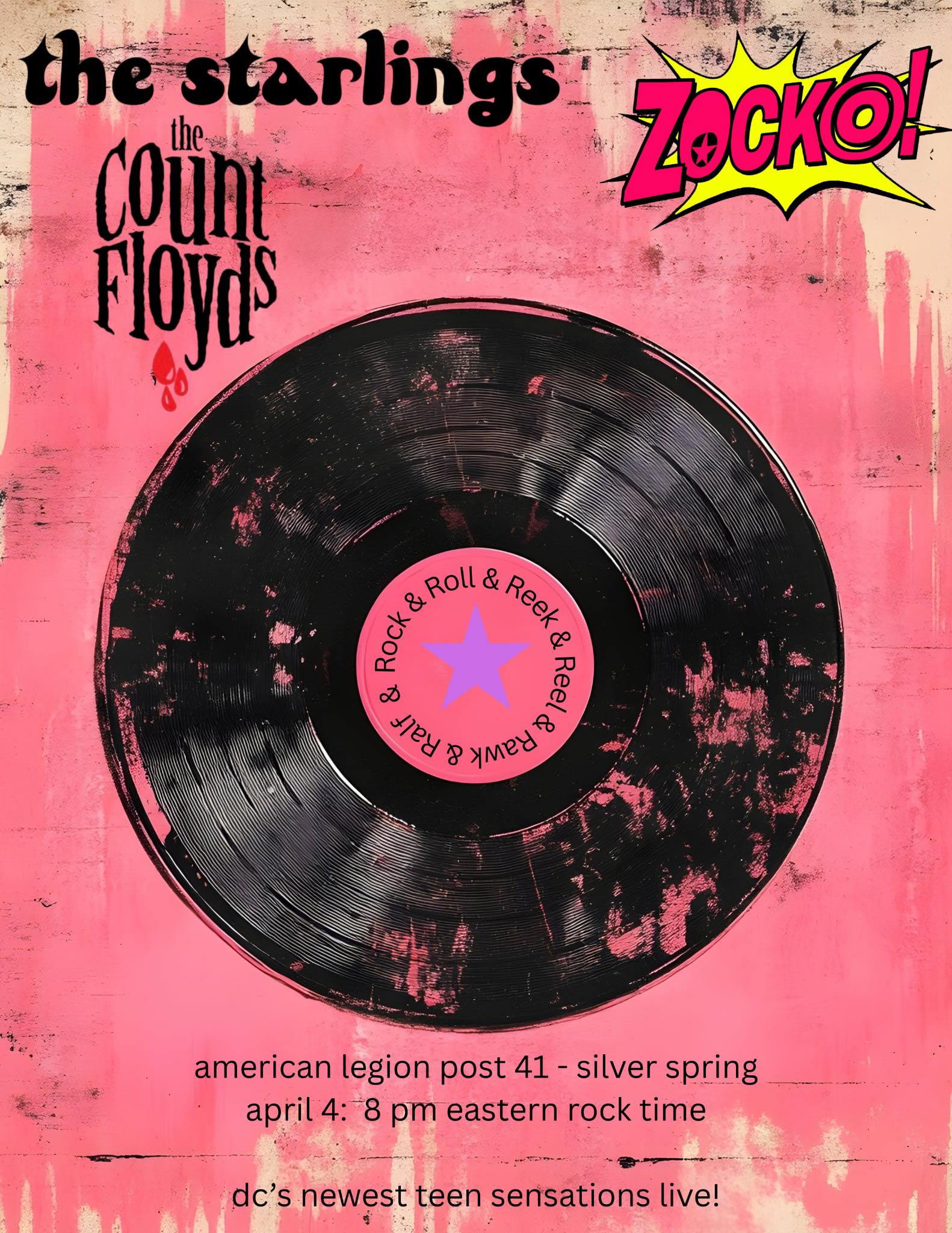 Sat April 4 - ZOCKO! with The Count Floyds and The Starlings, at American Legion Post 41. (Silver Spring, MD)