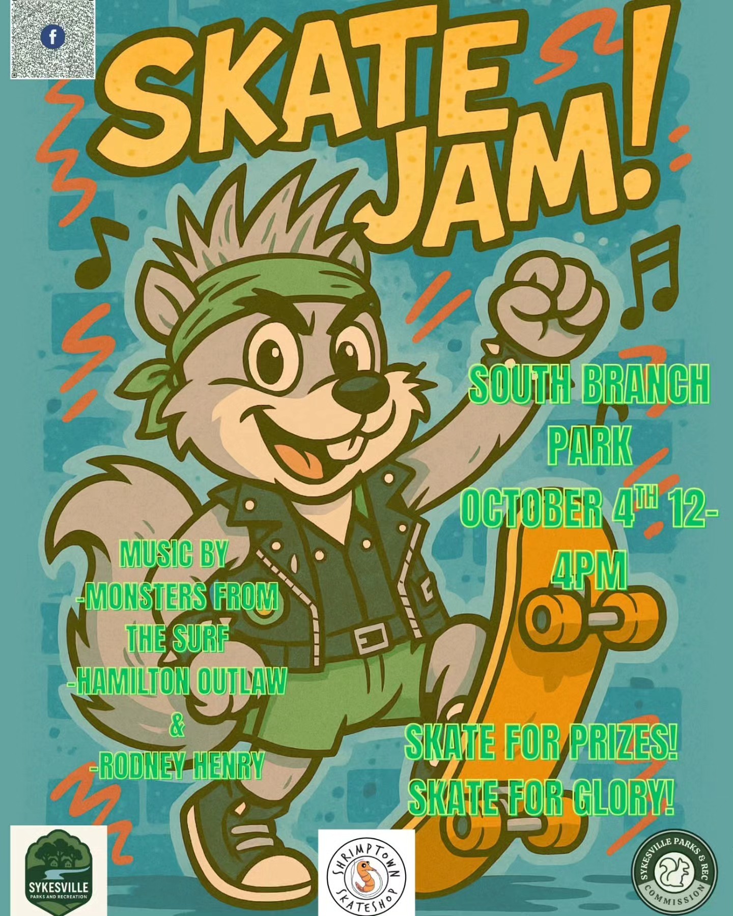 Sat Oct 4 - Skizz sits in on drums with Monsters From The Surf. Also performing: Rodney Henry and Hamilton Outlaw. At SKATE JAM!, the Shrimptown 10th anniversary party at South Branch Park. noon to 4PM (Sykesville, MD)