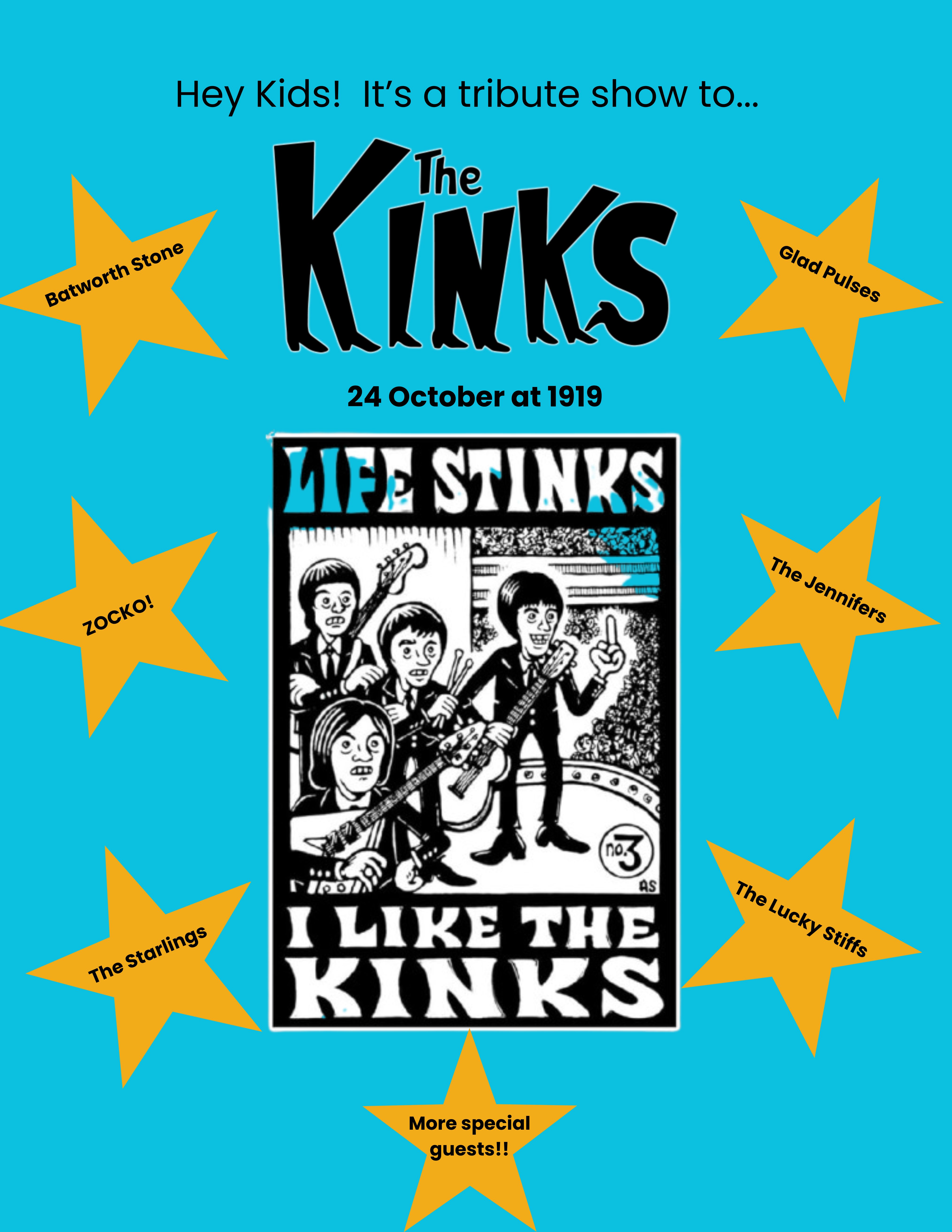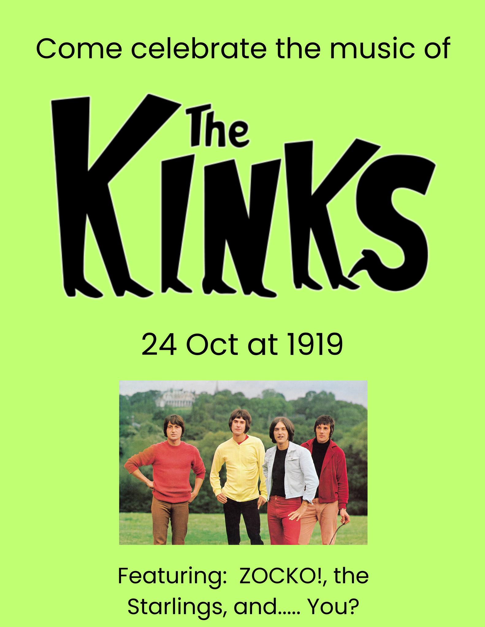Fri Oct 24 - ZOCKO! and The Jennifers perform as part of a Kinks tribute night, along with Batworth Stone, The Starlings, Glad Pulses, The Lucky Stiffs, and special guests. At 1919. (Facebook event page)