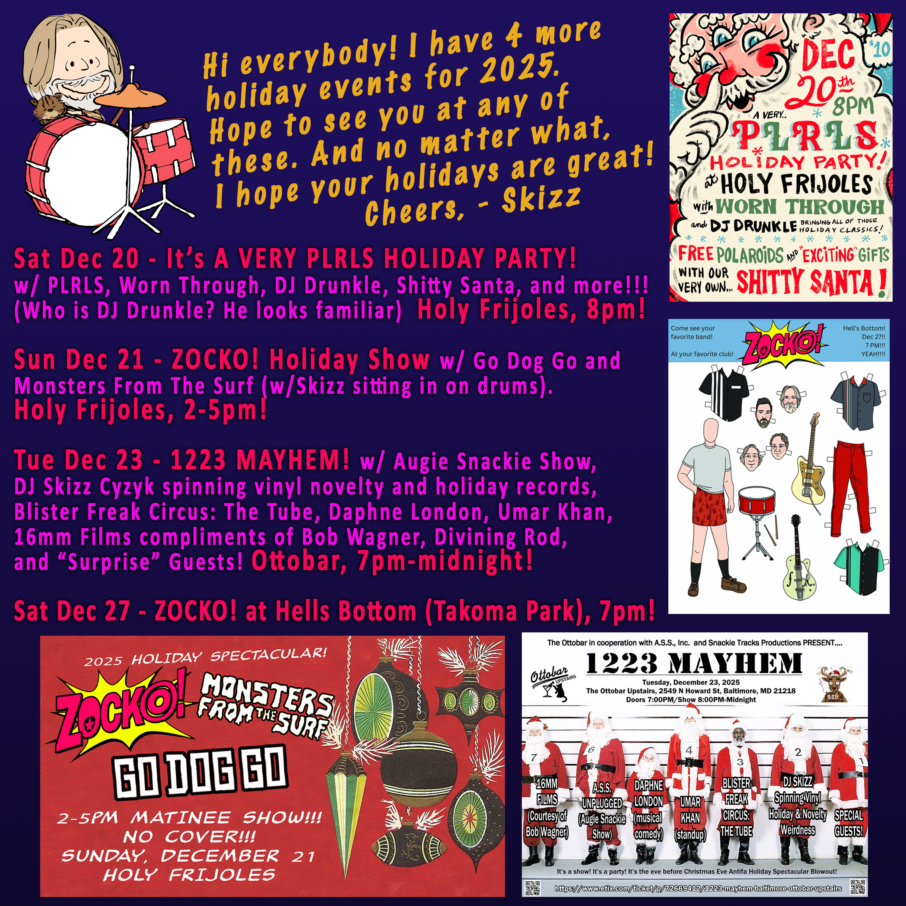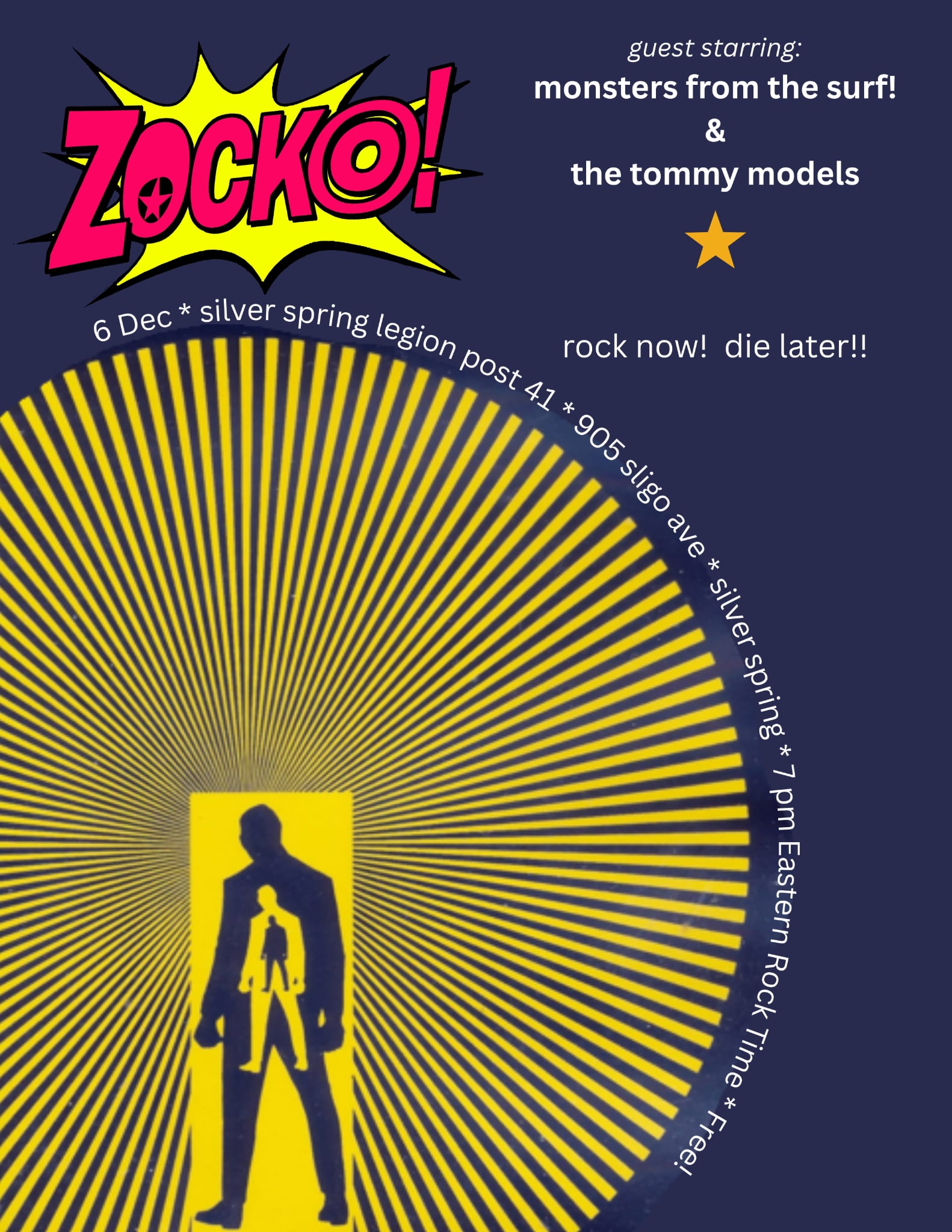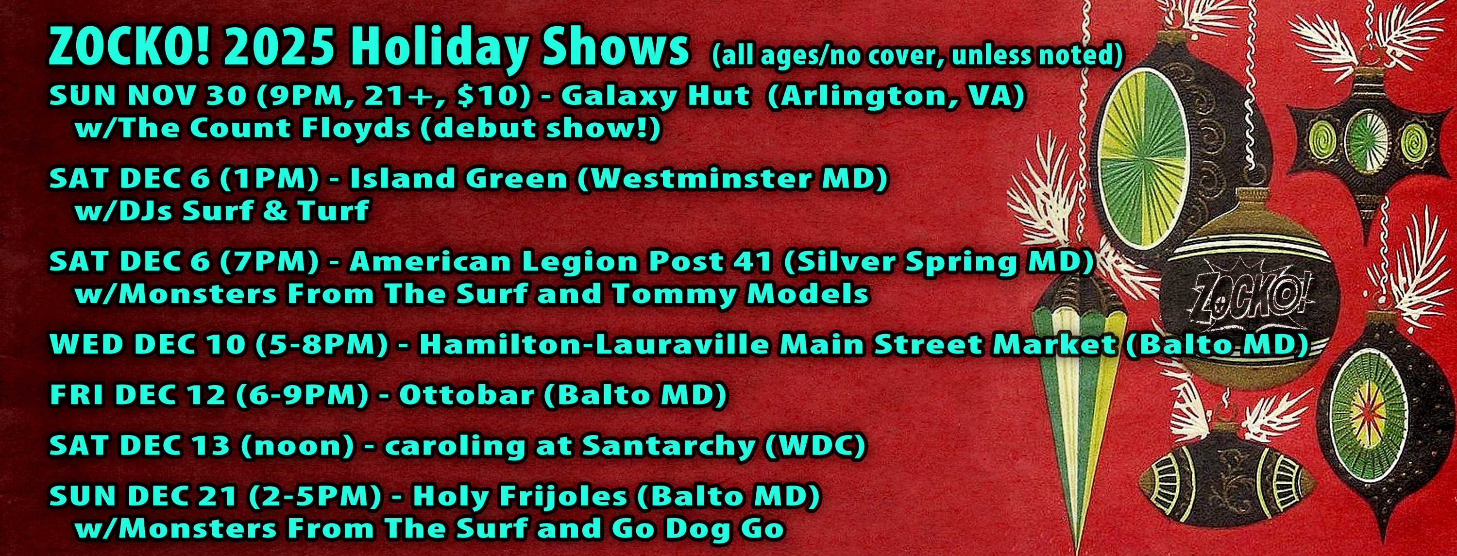Wed Dec 10 - ZOCKO! at Hamilton-Lauraville Main Street Market (5-8pm).Sat Dec 6 (evening) - ZOCKO! with Monsters From The Surf and The Tommy Models at American Legion Post 41. (Silver Spring, MD) (Facebook event page)