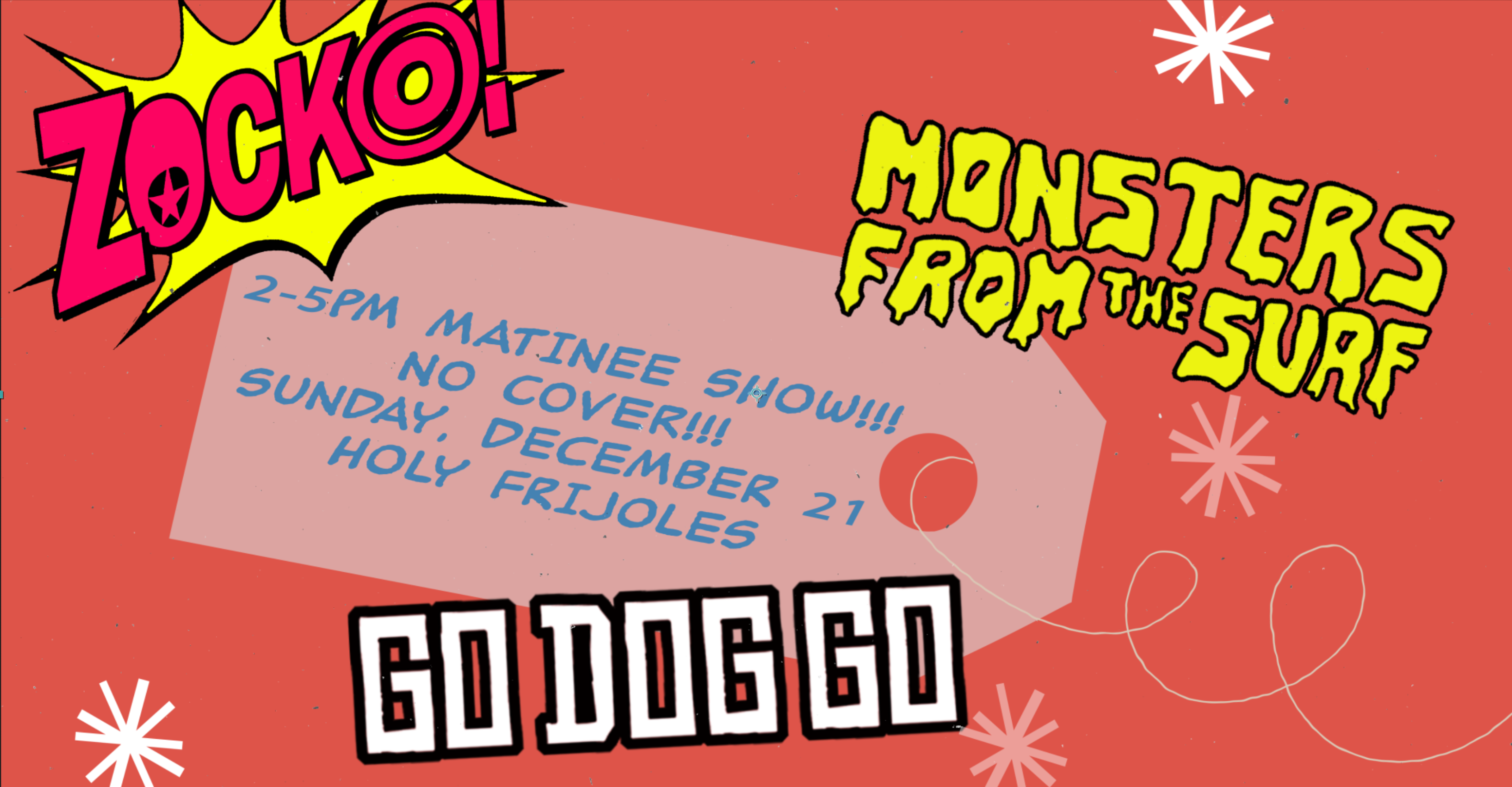 Sun Dec 21 - ZOCKO! with Monsters From The Surf (w/Skizz sitting in on drums) and Go Dog Go at Holy Frijoles. (Facebook event page)