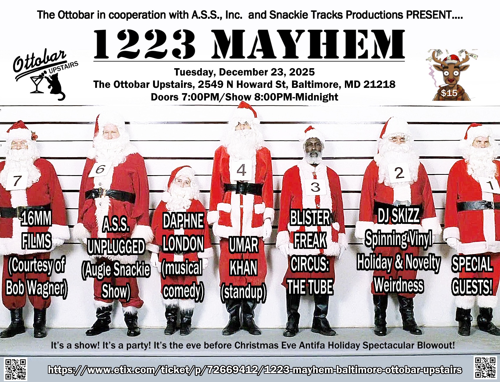 Tue Dec 23 - 1223 MAYHEM! featuring DJ Skizz Cyzyk spinning vinyl novelty and holiday records, Blister Freak Circus: The Tube, Augie Snackie Show UNPLUGGED, Daphne London, Umar Khan, 16mm Films compliments of Bob Wagner, and “Surprise” Guests! Ottobar. more info (Facebook event page)