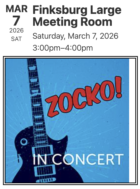 Sat March 7 - ZOCKO! at Carroll County Public Library - Finksburg Branch Large Meeting Room. 3pm. (Finksburg, MD) (details & register for free tickets)