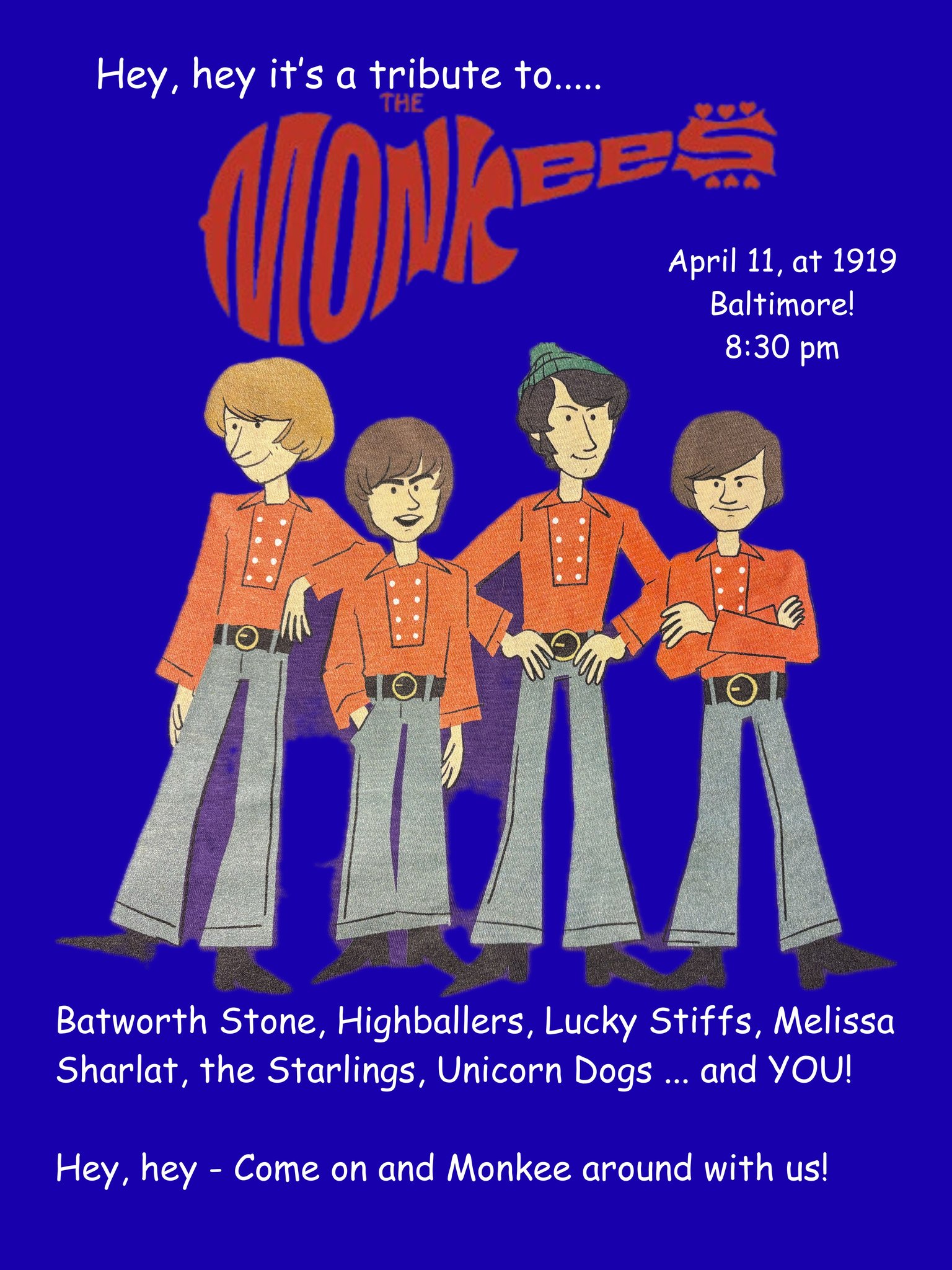 Sat April 11 - Monkees tribute show! Skizz perfroms as part of The Three of Pills (Skizz, Meatpole and Batworth from Go Pills), and fills in on drums for The Stiffs (Lucky Stiffs). At 1919. (Facebook event page)